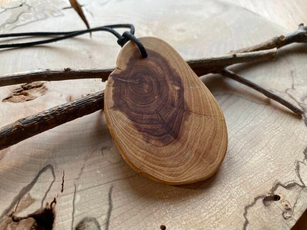Ein Stück Natur mit Charakter und sehr präsent: Der große, ovale Anhänger aus Wacholderholz trägt eine feine Brandmalerei, die der natürlichen Zeichnung des Holzes folgt und seine Linie unterstreicht. So entsteht ein stilles Zusammenspiel aus Form, Maserung und warmen Farbtönen.